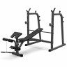 Расстояние между стойками скамьи составляет 63 сантиметра, что позволяет использовать большинство видов штанг. Угол наклона скамьи регулируется, что дает возможность выполнять различные виды жима лежа и другие упражнения.